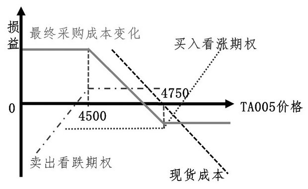 此外,聚酯工厂也可以在此基础上进一步卖出行权价格为4500元/吨的看跌期权,通过收取权利金降低策略成本。行权价格为4500元/吨的看跌期权价格约为50元/吨,整体策略组合的成本约为90元/吨。期权到期时,若TA005价格高于4750元/吨,则聚酯工厂可以将采购价格锁定在4840元/吨;若TA005价格低于4500元/吨,则聚酯工厂的采购价格为4590元/吨。