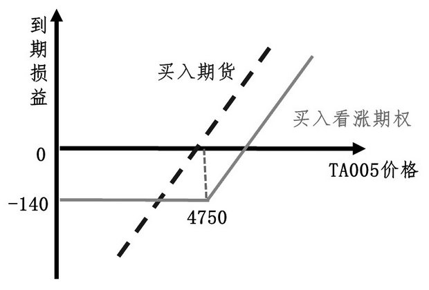 仍以TA005合约为例,当前价格在4750元/吨附近,平值看涨期权价格约为140元/吨,通过买入PTA平值看涨期权,在不考虑基差变动的情况下,当TA005价格上涨时,可以将采购价格最高锁定在4890元/吨。而当TA005价格下跌时,作为看涨期权的买方,聚酯工厂没有追加保证金的资金压力。同时,可以放弃行权,并以市场价格进行低成本采购。