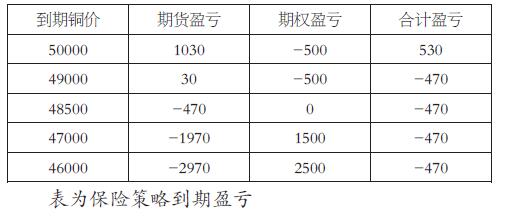期权的保险策略即在现货存在多头敞口的情况下,因担心铜价下跌而买入看跌期权。4月26日沪铜1906合约收盘价为48970,此时如果有现货多头敞口,随着铜价涨跌,盈亏情况将如图一中红色虚线所示,比如上涨到50000,就盈利1000,下跌到48000,就亏损1000。此时如果担心铜价下跌,就可以买入CU-1906-P-49000进行保值,期权费支出500元,该看跌期权的到期损益情况如图一中蓝色虚线所示,铜价跌破49000元越深,买入的看跌期权所得到的收益就越大。6月6日沪铜1906合约收盘价跌至46000,如果此前对多头敞口没有保值的情况下,该部分将会有2970的亏损,此时CU-1906-P-49000已经处于深度实值状态,可以按照3000的内在价值卖出,从而获得2500元的期权净收益,弥补现货多头敞口的损失。最终组合头寸的到期损益情况如图一中黄色实线所示。通过买入看跌期权保值之后,基本上规避了铜价下跌的风险,而对铜价上涨的潜在收益没有任何影响。目前,实际操作上,期权对应的标的物只能是期货而不能是现货,期权最终盈亏挂钩的是期货,同期货套保一样,期权套保也不能规避期现基差的风险。