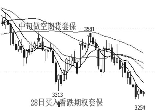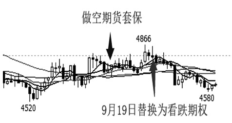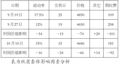 9月中旬某企业买入纸浆现货抛出纸浆2001期货保值,由于判断纸浆之后价格会走高,于是在9月19日将期货套保转换为买入执行价4850平值看跌期权套保,期权费109。但事与愿违,随后价格却逐步下跌,9月27日更是大跌至4650附近,此时期权费为235。虽然买入期权价值增加了,仍起到了一定的保值作用,但相对原来期货套保而言,套保效果明显打折扣。我们对其影响因素分析发现,9月27日期权波动率降低至12%,到期期限剩余19个交易日,标的价格下降、波动率降低、到期期限减少都对期权价值产生了不利影响,分别导致期权时间价值下降了74、34和13,三者的交叉影响导致期权时间价值增加了20。短时间内标的价格的快速下跌是造成这次套保效果不理想的主要原因,其次是标的波动率的下降,说明买入期权的时机不太合适,从而导致买入期权成本支出偏高。