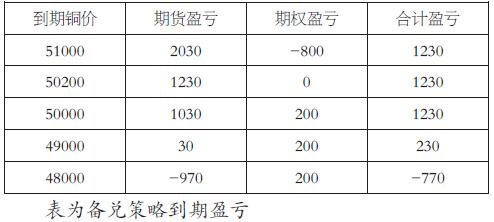 零成本策略是以上两种策略的组合,为了对现货多头敞口保值,在买入一个看跌期权的同时卖出一个看涨期权,买入看跌期权的期权费支出几乎和卖出看涨期权的期权费收入完全抵消,在没有资金收支的情况下,将现货多头敞口盈亏限定在一个范围之内。比如,可以买入一个CU-1906-P-48000同时卖出一个CU-1906-C-50000,此时现货多头敞口盈亏被限制在-1000—1000之间,最终组合头寸到期损益情况如图三中紫色实线所示。