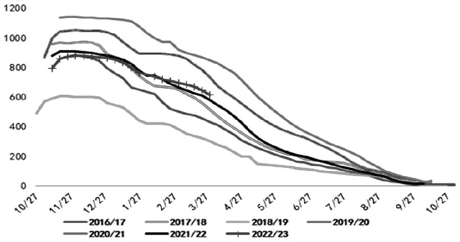 图为全国苹果库存走势 今年以来苹果2305合约呈现“倒V形”走势,1—2月表现为明显上涨,3月表现为明显下跌。近月合约强势为苹果期价提供了比较大的情绪支撑,同时现货端又出现了阶段性的利多因素,比如甘肃货源价格持续偏强、产区惜售以及炒货热情较高等,延长了苹果期价上行的时间。 进入3月,随着苹果销售窗口的缩短,市场对于接货价值的分歧有所增加,近月合约回落明显以及销区走货持续不理想,利多预期落空,期价高位回落。展望后市,市场趋势性推动因素有限,现货端分歧对于估值预期的影响加大,消费持续兑现不及预期的情况下,期价运行重心将下移。 现货价格高位运行 春节过后,产区交易比较活跃,甘肃货源以及小果表现较好,对整体市场情绪有一定拉动。同时产区炒货以及惜售情绪较高进一步提振现货价格,整体呈现振荡偏强态势。数据显示,3月下旬山东地区纸袋富士 80#以上一二级货源交易加权平均价格3.9元/斤,同比上涨0.6元/斤,为近5年同期次高水平;3月下旬陕西地区纸袋富士70#以上半商品交易加权平均价格4元/斤,同比上涨0.6元/斤,为近5年同期最高水平。现货价格相对高位,给期价带来了比较强的成本支撑。 今年以来,受“水果罐头”消费热潮以及部分品种局部减产影响,整体水果价格都呈现偏强运行,农业农村部数据显示,3月下旬6种重点监测水果批发平均价为8.19元/公斤,高于去年同期的6.8元/公斤,为近5年同期最高值。具体来看,6种水果中除菠萝外,其他水果都呈现一定幅度的上涨,西瓜、鸭梨、巨峰葡萄涨幅最为明显。整体水果价格走高,将对富士苹果相对估值起到比较大的支撑作用。 入库总量处于近5年同期低位 本年度入库总量处于近5年同期低位,奠定了库存供应压力不大的基础,也构成了苹果估值的支撑。据市场预估,本年度全国冷库入库量为878万吨,相比上一年度下降32万吨。不过,随着市场的不断消化,库存量同比增加所带来的边际变化使得初始入库量偏低支撑有所减弱,也就是说,苹果估值随着时间的变化出现了相对下移。数据显示,3月下旬全国冷库库存量为617.32万吨,高于去年同期的579.12万吨,不过略低于5年均值625万吨。 苹果消费影响估值区间。春节以后,苹果整体消费表现一般,无论是库存消耗量还是出口情况,都处于近5年同期的低位水平。数据显示,2月以来,冷库库存消耗量一直处于低位区间,2月累计消耗量为42.42万吨,远低于去年同期。苹果出口同样表现疲弱,海关总署数据显示,1—2 月苹果累计出口量为12万吨,继续为近5年同期最低值。消费持续疲弱对苹果的估值区间形成比较大的制约。 综合来看,一方面,整体水果价格上涨、现货价格高位运行以及库存处于相对低位给苹果市场带来较强支撑;但另一方面,消费表现疲弱以及库存同比回升又对其估值形成了明显压制。整体来看,当前市场趋势性推动因素有限,苹果期价或延续区间波动。(作者单位:方正中期期货) (责任编辑:admin) |