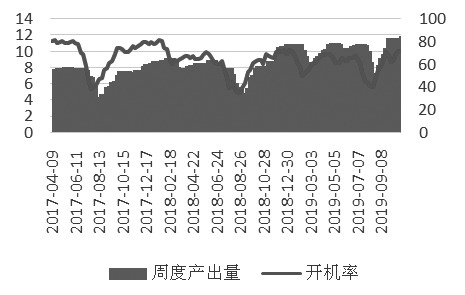 图为42家玉米酒精企业周度开工情况(单位:万吨/%)