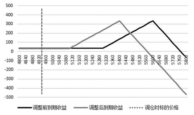 通过下调行权价,使得整个收益曲线左移。若持有期权到期时,标的价格上涨至5400元/吨,原策略组合收益为1350元/套,而调整后的收益为3315元/套;若标的价格仅上升至5200元/吨,原组合收益为350元/套,而调整后的收益为1315元/套。在小幅上涨行情下,调整后的策略组合收益大大增加,同时价格下跌或盘整时收益未有明显下滑。