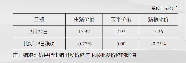 国家发改委:截至3月22日 猪粮比价周环比下跌0.75% 国家发改委 03月27日 据国家发改委,截至3月22日,全国生猪出场价格为15.37元/公斤,比3月15日下跌0.77%;主要批发市场玉米价格为2.92元/公斤,较3月15日持平;猪粮比价为5.26,比3月15日下跌0.75%。(文章来源:国家发改委) (责任编辑:admin)