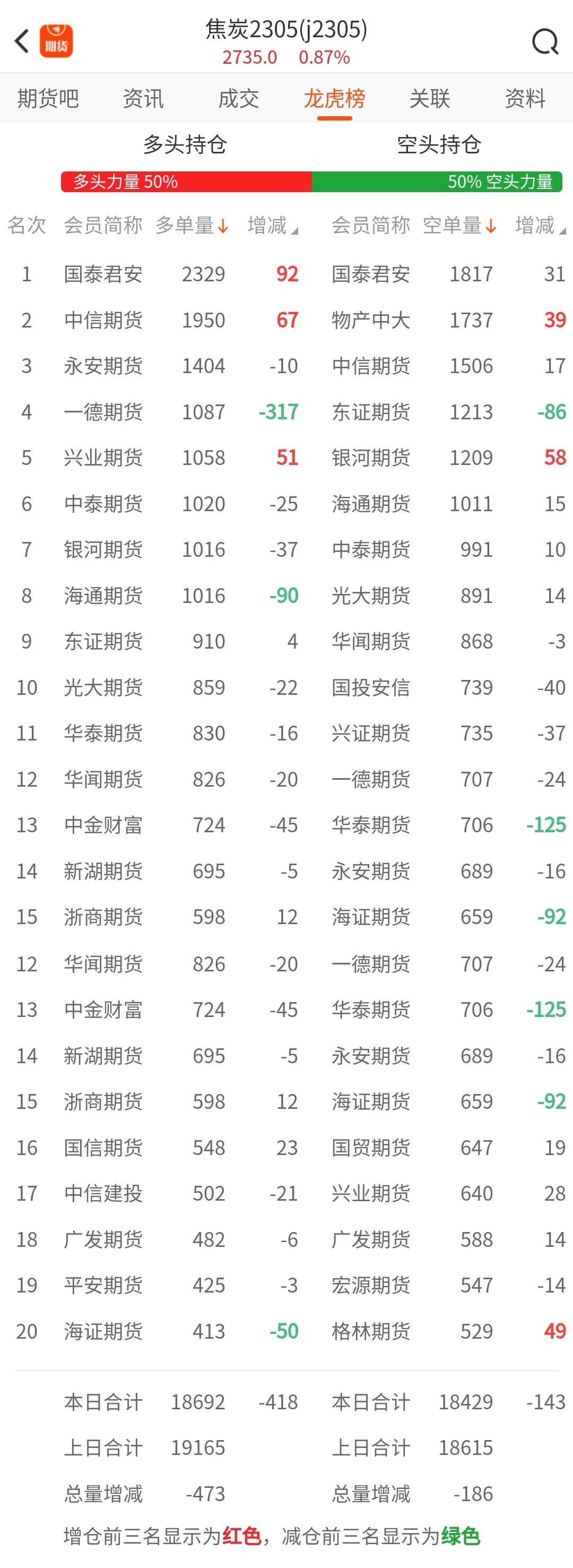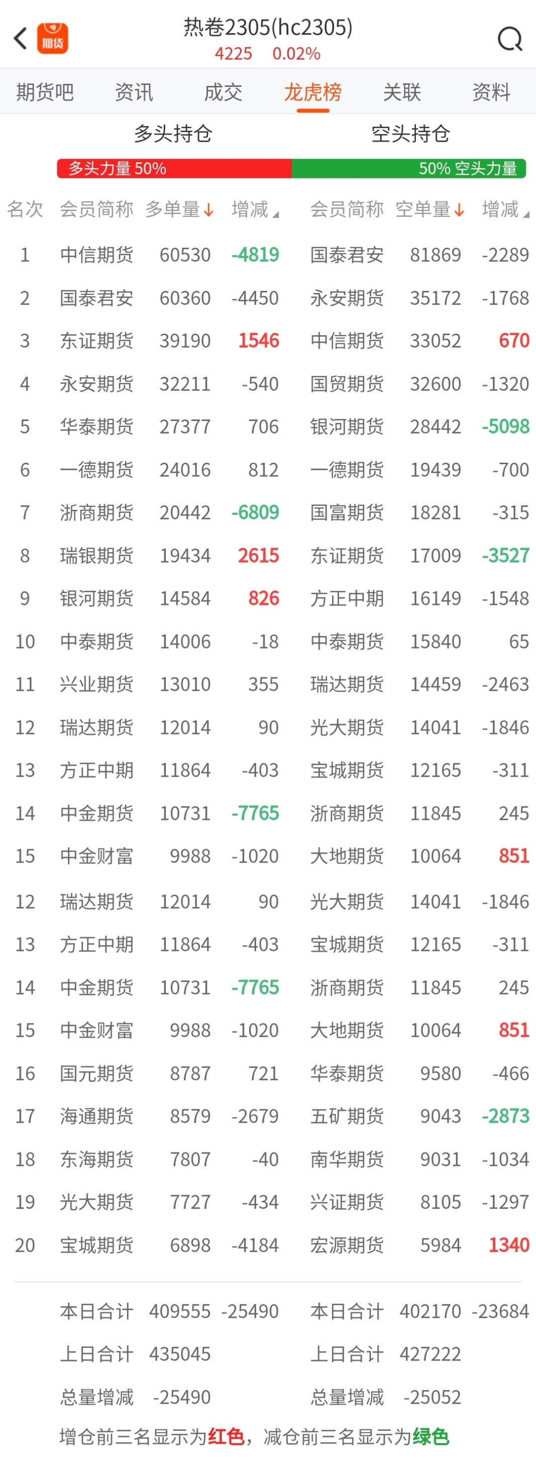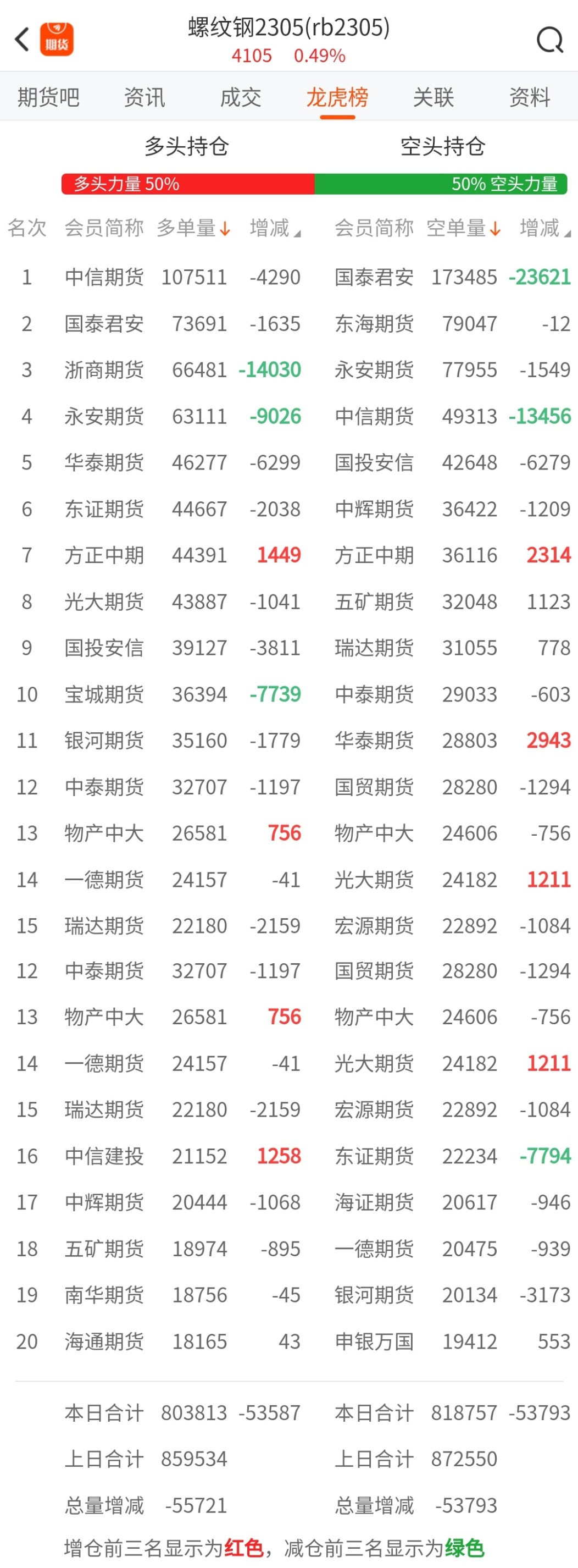 截至3月27日收盘,螺纹钢2305收4105/吨,涨0.49%;热卷2305收4225/吨,涨0.02%;铁矿石2305收873.5元/吨,涨2.16%;焦炭2305收2735/吨,涨0.87%;焦煤2305收1844元/吨,涨0.49%。 螺纹钢2305合约前20席位多单减仓53587手至80.3万余手,空单减仓53793手至81.8万余手。其中,国泰君安期货多单减持1635手,空单减持23621手,整体呈净空99794手。 各品种具体如下: ![]() 各品种持仓情况具体如下: ![]() ![]() ![]() ![]() ![]() 注:可通过点击东方财富期货PC端左侧“龙虎榜”栏目及东方财富期货APP行情页面“龙虎榜”栏目查看各类机构持仓及盈亏榜单信息。 ![]() ![]() (文章来源:东方财富研究中心) (责任编辑:admin) |