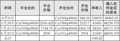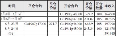 2月份,某投资机构通过研究认为,在中美贸易摩擦悬而未决的情况下,铜价不会有较大的波动,将以49000元/吨为振荡中枢,上下波动1000元/吨左右,于是决定卖出cu1905p48000合约,数量为100手左右,然后根据铜价变化展期操作。于是,2月20日到3月15日期间,该机构卖出cu1905p48000合约100手,均价329.2元/吨,净收入权利金164600元;持有到期,cu1905p48000未被行权,但铜价有走弱的趋势,继续展期操作,执行价选择47000元/吨,合约选择cu1907,4月25日到5月10日期间卖出cu1907p47000合约105手,净收入权利金107655元,并持有到期;6月份铜价继续下跌,期权合约可能被行权,最后到期日前展期操作,平cu1907p47000合约,开cu1909p46000合约,数量105手,净收入权利金197990元;8月下旬,铜价低位振荡,期权未被行权,继续展期操作,卖出cu1911p45000合约100手,均价243.34元/吨,净收入121670元,计划持有到期(操作结果如下表)。