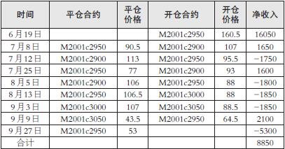 某投资者擅长豆粕期权交易,6月中旬豆粕再次冲高回落后,其通过研究认为豆粕2001合约价格主要运行区间在3000元/吨之下,于是决定卖出看涨期权,保持执行价与豆粕期货价格的价差在50—100元/吨。6月19日,其卖出M2001c2950合约10手,均价160.5元/吨,净收入16050元;7月8日,平M2001c2950合约,平仓均价90.5元/吨,开M2001c2900合约,开仓均价107元/吨,净收入1650元;7月12日,平M2001c2900合约,平仓均价113元/吨,开M2001c2950合约,开仓均价95.5元/吨,净收入-1750元;7月25日,平M2001c2950合约,平仓均价77元/吨,开M2001c2900合约,开仓均价93元/吨,净收入1600元;8月5日,平M2001c2900合约,平仓均价106元/吨,开M2001c2950合约,开仓均价88元/吨,净收入-1800元;8月13日,平M2001c2950合约,平仓均价106.5元/吨,开M2001c3000合约,开仓均价88元/吨,净收入-1850元;9月3日,平M2001c3000合约,平仓均价107元/吨,开M2001c3050合约,开仓均价88.5元/吨,净收入-1850元;9月9日,平M2001c3050合约,平仓均价43.5元/吨,开M2001c2950合约,开仓均价64.5元/吨,净收入2100元;为规避十一长假风险,9月27日平仓了结,平仓价53元/吨,支付5300元(操作结果如下表)。