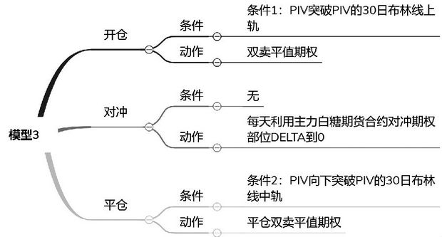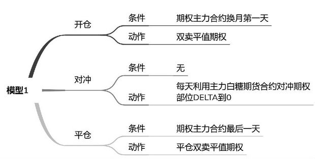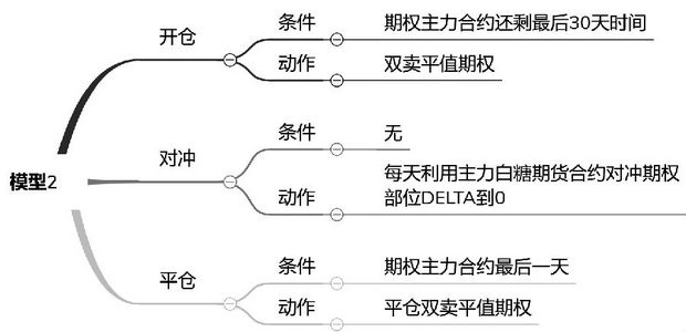 模型1是3个模型的比较基准。图2展示了模型1的详细逻辑,其开仓条件是时间开仓,是白糖期权主力合约上市第一天开仓,具体操作是双卖当天的平值期权,建立跨式策略;其对冲逻辑是每日收盘时对冲,冲掉期权部位的Delta,保持Delta中性原则;其平仓条件与开仓条件类似,也是基于时间的平仓,是白糖期权主力合约到期的当天平仓。该模型没有进行任何的择时操作,只是简单的每天进行波动率交易。