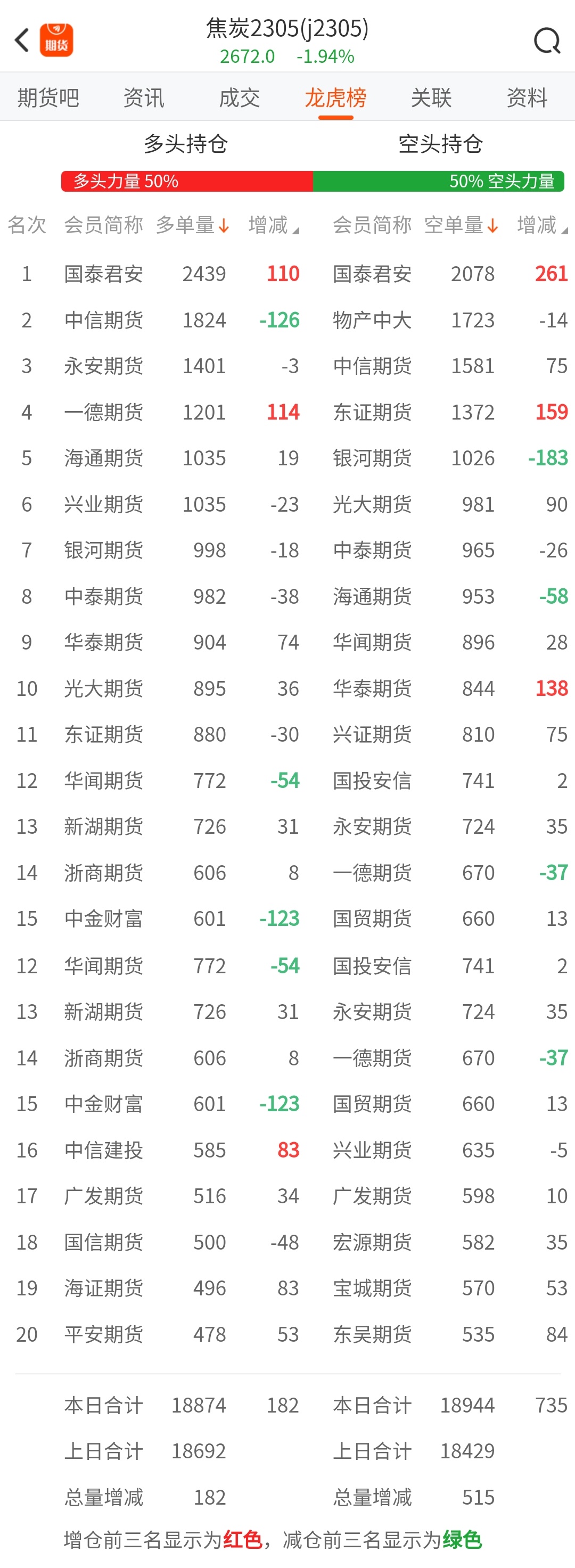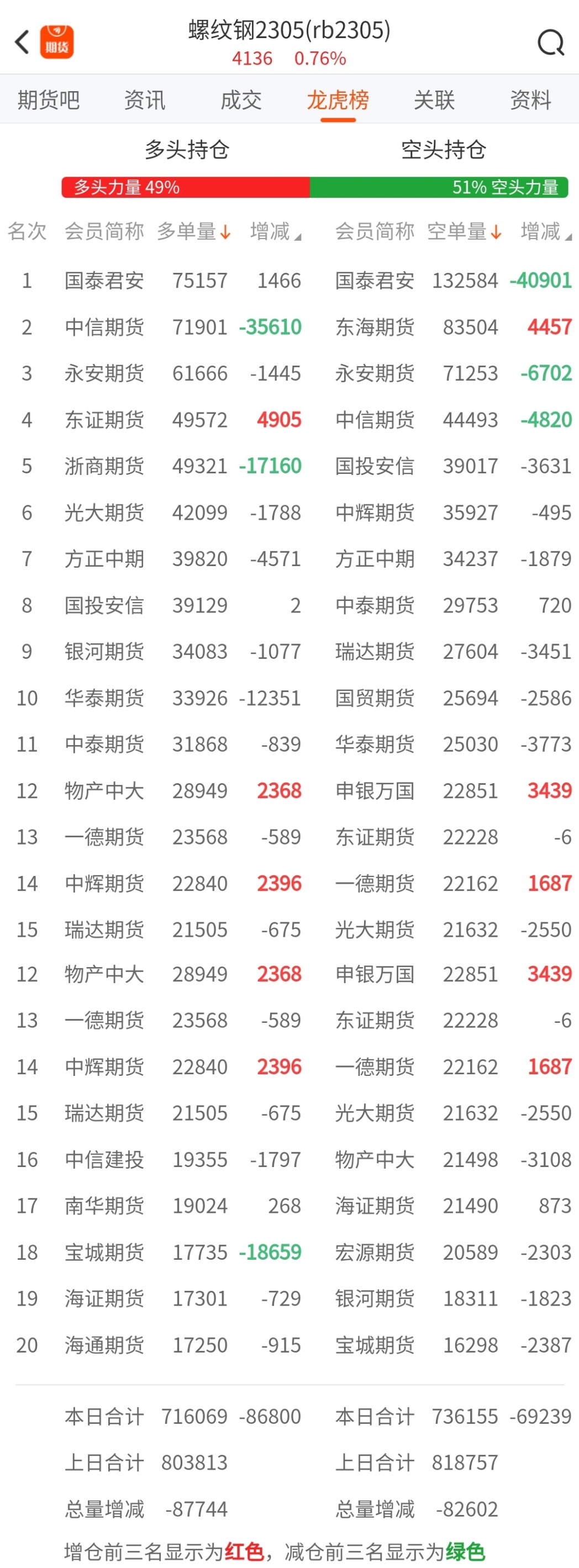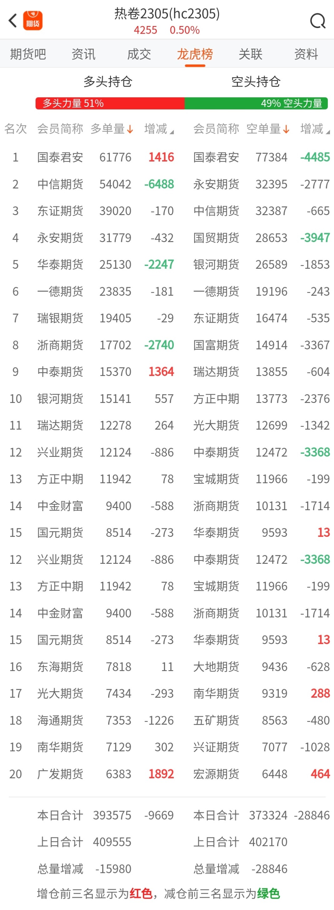 截至3月28日收盘,螺纹钢2305收4136/吨,涨0.76%;热卷2305收4255/吨,涨0.5%;铁矿石2305收882元/吨,涨1.79%;焦炭2305收2672/吨,跌1.94%;焦煤2305收1817.5元/吨,跌1.25%。 螺纹钢2305合约前20席位多单减仓86800手至71.6万余手,空单减仓69239手至73.6万余手。其中,国泰君安期货多单增持1466手,空单减持40901手,整体呈净空57427手。 各品种具体如下: ![]() 各品种持仓情况具体如下: ![]() ![]() ![]() ![]() ![]() 注:可通过点击东方财富期货PC端左侧“龙虎榜”栏目及东方财富期货APP行情页面“龙虎榜”栏目查看各类机构持仓及盈亏榜单信息。 ![]() ![]() (文章来源:东方财富研究中心) (责任编辑:admin) |