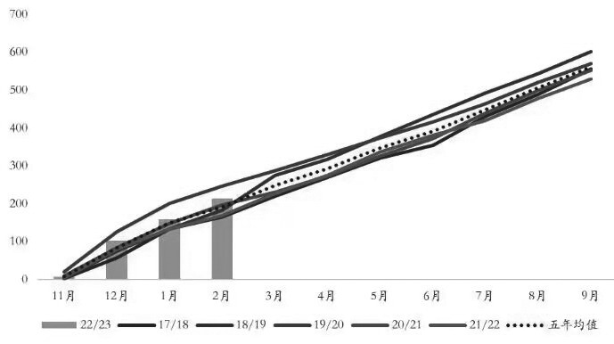 图为广西累计销糖量(单位:万吨) 第二,站在加工糖的角度来看——进口成本窗口关闭,预计正规糖源供应压力后置。 目前,ICE原糖价格持续处于高位水平。此前,ICE原糖03合约和05合约的高价差在03合约交割之后,通过05合约升贴水报涨的方式收敛,15%关税的进口成本已经突破5600元/吨,50%关税的进口成本涨至7000元/吨以上,正规途径的糖源进入国内市场非常艰难。接下来,随着广西逐渐收榨,定价权将逐渐向加工糖转移,也就意味着国内外食糖的关联度将更加紧密,ICE原糖也呈现出Back结构。此外,若巴西顺利开榨,6—7月将迎来巴西糖的出口旺季,而ICE原糖远月价格压力高于近月,也就意味着远月进出口成本低于近月,由此预计正规糖源的供应时间后置。 第三,站在贸易商的角度来看——现货成交情况一般导致大量库存堆积在贸易商手中。 春节前,贸易商从糖厂大量买货并套盘,贡献了糖厂的销糖量,但春节后郑糖并没有回头,同时进入传统消费淡季,下游对高价糖的接受度偏低,食糖基差走弱没有给到贸易商出货的机会,从而导致目前大量库存积压在中端。展望后市,可能出现转机的或是五一节前贸易商备货,届时若现货需求增加,那么基差或有走强的可能性,从而给贸易商带来解套的机会。 第四,站在终端的角度来看——下游接货意愿偏淡,但存在被迫接受高价糖的风险。 上个榨季的结转库存与前一年持平,均为近7年来的绝对高位水平。部分终端在本榨季初期消化了大量陈糖库存,同时今年糖厂初期预售了价格相对低的新糖,给终端带来补库机会。然而,目前处于传统消费淡季,下游很难接受高价糖导致产销价格倒挂。接下来,上游和下游的博弈焦点在于,下半年将进入传统消费旺季,库存逐渐被消化后市场将有补库需求,若ICE原糖价格依然处于高位水平,正规渠道的进口糖将难以进入市场,那么短期或存在食糖供需错配的可能性,下游将被迫接受高价糖。不过,若糖价持续高涨,或引发糖浆对食糖使用的替代。 未来如何弥补全球食糖产需缺口 有关部门公布的数据显示,2月将甘蔗单产下调4.8吨/公顷,将食糖总产量下调72万吨,食糖产需缺口进一步扩大,需要进口糖源进行弥补。随着国产糖逐渐收榨,食糖的定价权将逐渐向进口糖源转移,但是目前在贸易流紧张的背景下,ICE原糖价格依然处于高位水平,近月和远月进口利润窗口全线关闭。笔者认为,未来国内市场交易最核心的问题将是在进口利润倒挂的背景下如何弥补食糖产需缺口,这也取决于外盘后市的发展方向,而国际市场的关注焦点则是印度食糖减产能否充分交易,以及巴西糖丰产的预期能否被证实。 第一,ICE原糖和巴西糖升贴水报价同涨——短期紧张的贸易流暂难缓解。 ICE公布的交割数据显示,ICE原糖03合约到期的交割量为11519手(约58.5万吨),远低于去年同期的134万吨,也低于过往5年均值水平,其中用于交割的食糖接近99%为巴西糖。偏低的交割数量印证着当前紧张的贸易流。 ICE原糖03合约交割后,超预期上涨的不仅是刚成为主力的ICE原糖05合约,还有巴西糖出现升贴水。ICE原糖03合约交割后,3月和4月船期的巴西糖升贴水从0.06美分/磅涨至1.71美分/磅,升贴水上涨的原因:一是此前ICE原糖03合约与05合约的高价差(2.09美分/磅)逐渐收敛;二是在ICE原糖继续上行的背景下,巴西糖升贴水再度上调至1.81美分/磅。笔者认为,ICE原糖和巴西糖升贴水同涨,背后的逻辑是3—4月国际原糖供应依然维持紧张状态。 第二,印度糖超预期减产抵消巴西糖增产——全球食糖供应端容错率降低。 关于印度糖超预期减产的题材持续发酵,印度糖产量预计低于行业机构和政府机构此前的预估。据市场消息,由于主要种植区降雨过多以及季风降雨后半段时间里光照不足,加之甘蔗普遍早熟,也意味着印度将提前收榨。此外,主产区马邦和卡邦的部分糖厂当前已经面临蔗料不足的情况,从同比减少的食糖产量和同比增加的收榨糖厂数量能够得到初步印证。印度糖厂协会(ISMA)发布的公告显示,截至3月15日,2022/2023榨季印度食糖产量为2818万吨,较上个榨季同期的2845万吨下降27万吨。当前已有194家糖厂收榨,高于去年同期的78家;尚在压榨的糖厂有336家,低于去年同期的438家。