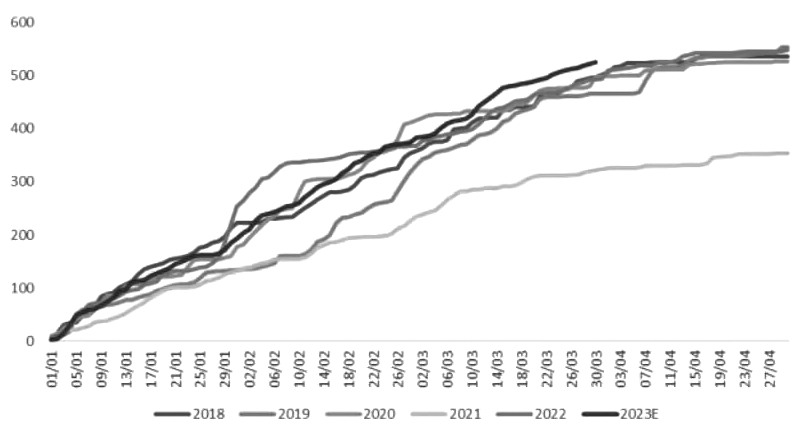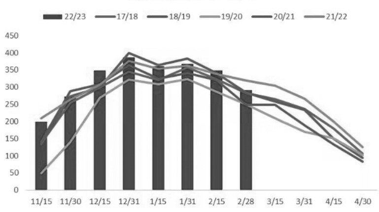 图为印度双周糖产量(单位:万吨) 印度糖的生产高峰已过,减产预期充分反应后,交易重心将转向巴西丰产预期是否落空。目前,市场对印度糖产量的预估在3300万—3400万吨,若印度没有进一步出口计划,那么2022/2023年度印度糖出口量将同比缩减超500万吨,吞噬巴西400万吨的增产预期,全球食糖供需将从过剩预期转向紧平衡,供应端的容错率将变低。 目前,市场将太多缓解紧张贸易流的期许放在巴西身上:一方面,2022/2023榨季剩余800万—900万吨甘蔗,2023/2024榨季巴西提前开榨的预期强烈;另一方面,由于2022年巴西降雨充沛,2023/2024榨季甘蔗生长情况良好,并且当前制糖较制醇的收益更好,预计下个榨季巴西糖产量也将增加。不过,一旦巴西出口放量的预期落空,或者再次出现印度糖增产落空导致价格反弹的情况,那么巴西提前开榨的预期也将落空,届时巴西糖集中进入市场的时间点有向后推迟的风险,全球贸易流紧张的现实将延续,3月和4月船期的巴西糖升贴水报价也将持续处于相对高位水平。