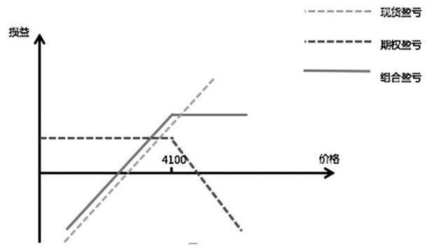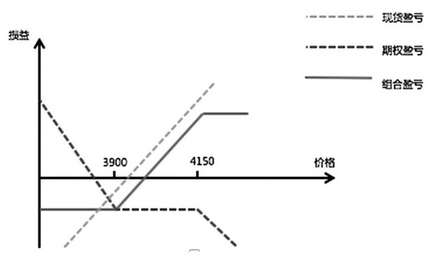如果螺纹钢价格下跌,跌幅超过100元/吨时,贸易商愿意主动购货。假设当前螺纹钢主力合约价格是4000元/吨,则可在买入4100看涨期权的基础上卖出执行价为3800的看跌期权,组合权利金为5元/吨,则30日后,封顶采购价位4100元/吨,价格低于3800时,实现采购目的。