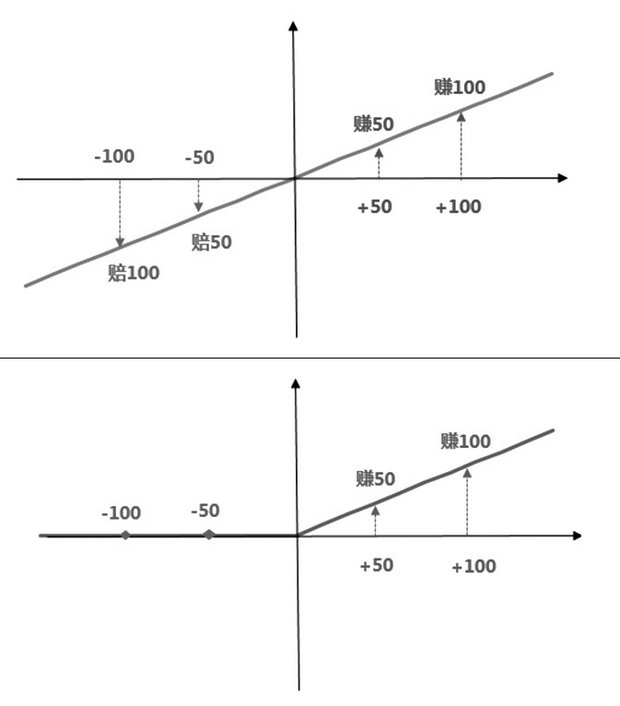 图为期货多头与看涨期权多头损益对比