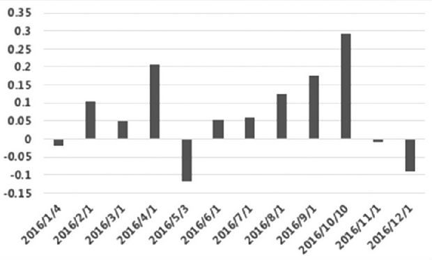 图为焦煤主力合约月度涨跌幅走势(2016年)