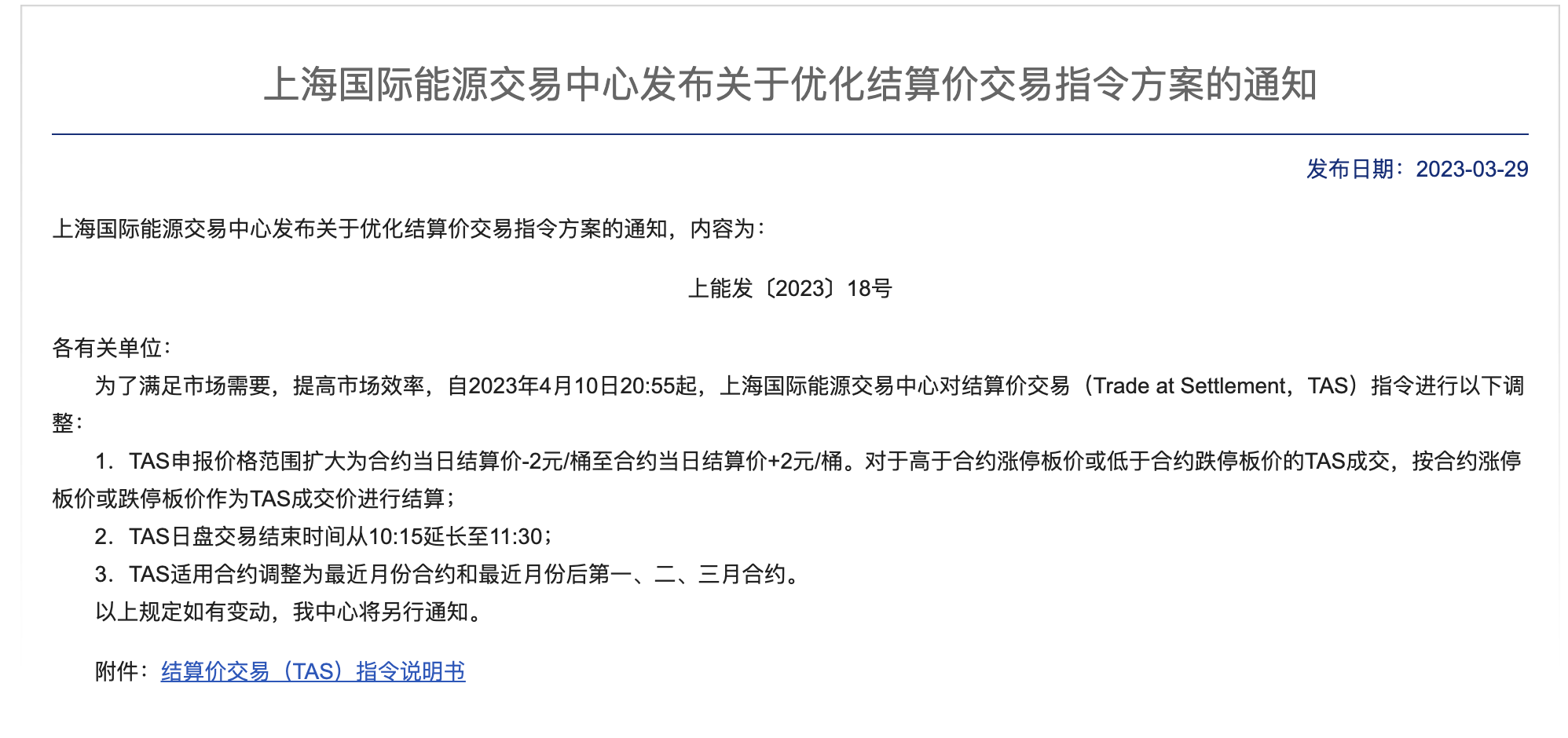 上海国际能源交易中心发布关于优化结算价交易指令方案的通知 第一财经 03月29日 上海国际能源交易中心发布关于优化结算价交易指令方案的通知。自2023年4月10日20:55起,上海国际能源交易中心对结算价交易(Trade at Settlement,TAS)申报价格范围扩大为合约当日结算价-2元/桶至合约当日结算价+2元/桶;TAS日盘交易结束时间从10:15延长至11:30;TAS适用合约调整为最近月份合约和最近月份后第一、二、三月合约。(文章来源:第一财经) (责任编辑:admin)