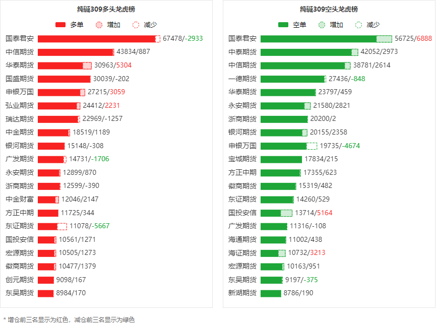 周三纯碱主力合约收跌2.54%,收盘报2452元/吨。 当日持仓为658672手,较前一交易日增加24239手。 日内资金流入0.88亿元。 多空持仓:今日前20席多头持仓405280手,共占全市场62%,其中多头第一名国泰君安占全市场10%。 前20席空头持仓410139手,共占全市场62%,其中空头第一名国泰君安占全市场9%。 前20席整体呈净空4859手,较前一交易日的净多6402手减少11261手。 ![]() 净仓趋势:下图可以看出,前20席位净持仓较长时间内处于平衡态势。 ![]() 持仓动向:就多头而言,今日前20席较前一日增仓7828手,其中华泰期货、申银万国、弘业期货增仓明显,三机构分别增仓5304手,3059手和2231手。 就空头而言,今日前20席较前一日增仓23915手,其中国泰君安、国投安信、海证期货增仓明显,三机构分别增仓6888手,5164手和3213手。 ![]() 盈亏剖析:数据显示,一周内弘业期货、国盛期货、瑞达期货在纯碱上盈利居前,三机构分别盈利5214.37万元,5047.69万元,4657.42万元。 ![]() 一周内中泰期货、南华期货、宝城期货在纯碱上亏损居前,三机构分别亏损8278.91万元,6454.91万元,4335.28万元。 ![]() 同时下图可以看出,近几个月内国盛期货席位净持仓与纯碱309合约期价走势呈一定程度正相关。 ![]() 总体而言,纯碱309合约今日增仓下行,多空持仓排名前20席中,多空双方均呈进场态势,多头进场意愿弱于空头。 注:可通过点击东方财富期货PC端左侧“龙虎榜”栏目及东方财富期货APP行情页面“龙虎榜”栏目查看各类机构持仓及盈亏榜单信息。