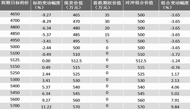 7月2日白糖现货报价为5125元/吨,最接近平值期权的行权价为5100元/吨,买进100张SR1909-P-5100,支付权利金115.5×100×10,即11.55万元,合计资金为512.5万元加上11.55万元,共524.05万元。权利金占总金额的比例为2.20%。从表6可以看出,当糖价下跌时,买进看跌期权进行保险后的对冲组合变动幅度低于现货变动幅度,最大损失为2.68%。之所以最大损失大于权利金占比是因为下跌的保险起点是5100元/吨,而不是5125元/吨,这中间有25元/吨的价格风险没有被保护。