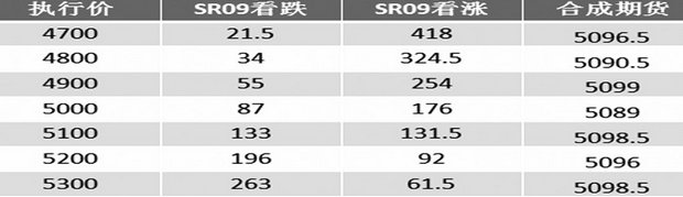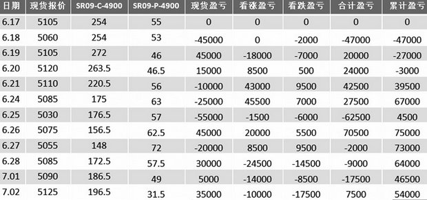 具体操作是卖出100手SR1909-C-4900、买进100手SR1909-P-4900,此时收到的净权利金为(254-55)×100×10,即19.9万元。表3为期权合成卖期保值动态盈亏,可以看出,利用期权合成头寸,保值效果明显。