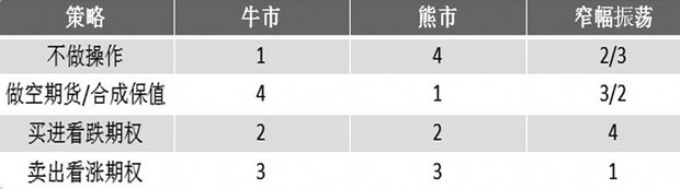 不管何种策略,最终的效果多受到市场行情的影响。后市是牛市的话,效果最好的是不进行卖保,此时可获得标的上涨的全部收益;之后是买入看跌期权,除了损失一点权利金,同样可以获得标的上涨的潜在收益;再之后是卖出看涨期权,虽然判断错了行情卖权,导致标上涨的收益空间被放弃,但还是可以得到一笔权利金;效果最差的是卖空期货和期权合成,对冲掉了本来可以获得的上涨收益。后市是熊市的话,情况相反。后市为振荡市的话,最优策略是卖出看涨期权,最差策略是买进看跌期权。具体的效果排名,见表12。