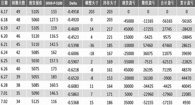 糖厂决定买进平值期权SR1909-P-5100,6月17日收盘价为133元/吨,假定无风险利率为2%,年度波动率为18%,B-S模型测算的Delta值为0.4918,为了实现Delta中性,需要买进100/0.4918,即203手SR1909-P-5100。每日收盘时按收盘价调仓一次,测算的数据如表4。