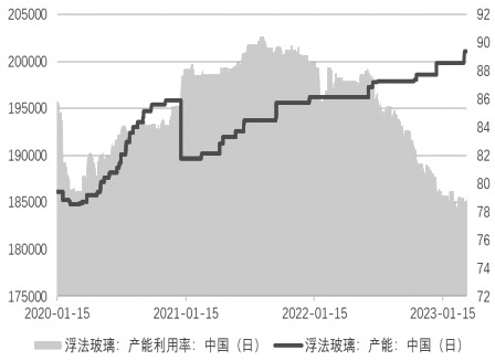 图为纯碱利润(元/吨) 受益于光伏产业快速发展,纯碱行业利润迅速提高。截至2023年3月24日,纯碱利润延续上涨态势。据统计,国内联碱企业利润为1958.1元/吨,同比上涨2.09%;氨碱企业利润为1109元/吨,同比上涨25.31%。 一季度纯碱市场暂无大规模检修计划,国内纯碱整体开工高位运行。国家统计局数据显示,2023年1—2月,纯碱产量502.9万吨,相较于2022年的467.20万吨,增加35.7万吨。截至2023年3月24日,钢联数据统计纯碱整体开工率92.42%,环比增加1.89%,同比增加6.94%。 综合来看,纯碱生产利润高位延续,开工相对稳定,预计产量、开工率或持续高位运行为主。 浮法玻璃产销态势较好 玻璃企业盈利情况有所改善,不过仅有以石油焦为燃料的浮法玻璃利润为正。截至2023年3月24日,钢联数据统计国内浮法玻璃产能为15.79万吨/日,环比增加0.89%,同比降低8.74%。 新能源发展背景下光伏产能增速较快,加之双碳目标加持,光伏产线投建较多,并陆续达产,近3年光伏玻璃日熔量呈现明显的增加趋势。截至2023年3月24日,钢联数据统计光伏玻璃产能为8.5万吨/日,环比增加3.16%,同比增加83.98%。