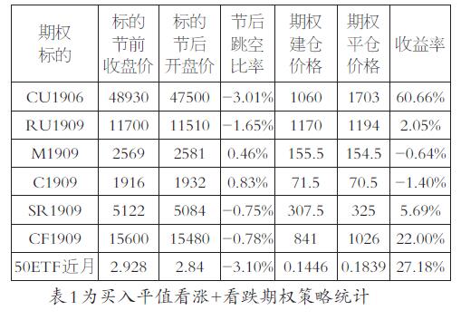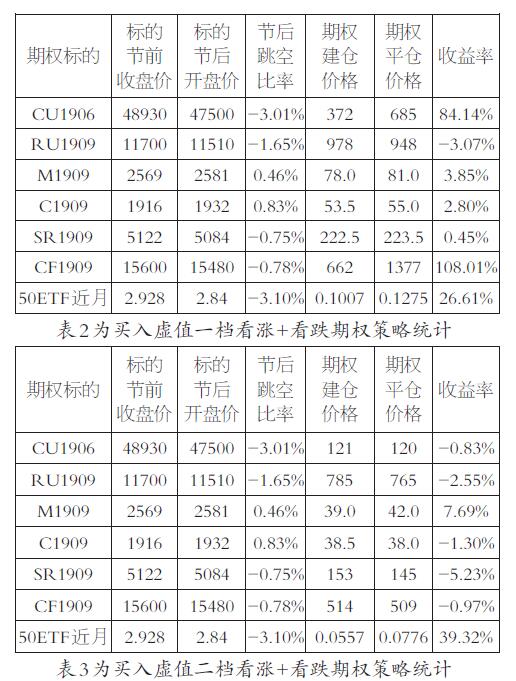 按照上面的思路,我们对6个商品期货期权和50ETF期权进行2018—2019年重大节假日和会议的历史回测,其中包括2018年春节、2018年国庆节、2018年11月30日—12月1日G20峰会、2019年春节、2019年劳动节等。由于铜、橡胶、玉米和棉花期权上市时间较短,仅回测2019年的数据。以节假日前的收盘价进行交易,构建3组交易策略,分别为买入平值看涨+看跌期权(对应跨式多头策略)、买入虚值一档看涨+看跌期权和买入虚值二档看涨+看跌期权。商品期权交易主力合约,50ETF期权交易近月合约。节后首个交易日开盘平仓,暂不考虑交易手续费及买卖价差。相关结果较为相似,限于篇幅,我们仅展示2019年劳动节前后的交易结果,如表1—3。节后跳空比率=(标的节后开盘价-标的节前收盘价)/标的节前收盘价,其衡量标的节前节后的变动幅度,幅度越大,说明突发消息的影响越大,对标的资产价格走势的影响也越大。