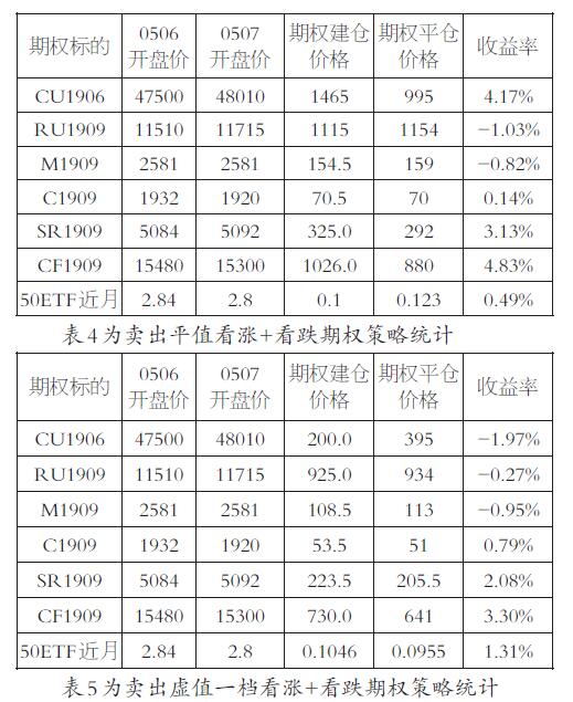我们以2019年劳动力前后的行情为例,从事后的角度来看,5月6日的行情更像是第三种“一日游”行情。考虑到市场的高亢情绪在开盘后会集中释放,我们以5月6日开盘价进行交易,以5月7日开盘价平仓(实际上可考虑更久的持仓时间),依旧构建3组交易策略,分别为卖出平值看涨+看跌期权、卖出虚值一档看涨+看跌期权和卖出虚值二挡看涨+看跌期权。卖出期权的保证金在交易所规定基础上加5%,暂不考虑手续费和买卖价差,交易结果如表4—6。