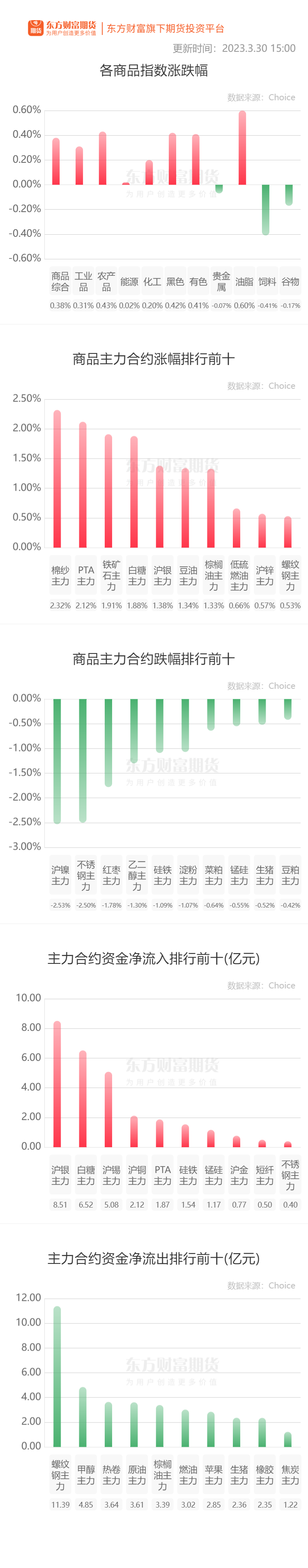 宏观要闻据法新社等多家外媒30日报道,巴西政府周三表示,巴西已与中国达成协议,不再使用美元作为中间货币,而是以本币进行贸易。(环球时报) 当前,房地产市场正出现一系列积极变化。一方面,多地首套房贷款利率、首付比例下行,市场销售降幅明显收窄;另一方面,房地产企业融资环境持续改善,房地产开发投资降幅收窄。(经济日报) 3月29日,乘联会发布最新数据显示,3月1-26日乘用车市场零售102.1万辆,同比去年同期下降1%,较上月同期下降17%。今年以来累计零售370万辆,同比下降15%;新能源车市场零售38.7万辆,同比去年同期增长10%,较上月同期增长1%。今年以来累计零售115.7万辆,同比增长18%。(财联社) 品种资讯农副类 生猪:3月步入尾声,国内生猪市场在需求弱势制约下,月内整体延续下行行情。近日市场对非洲猪瘟关注热情再度提升,但记者从行业上市公司及分析人士处了解到,目前疫情对产能整体影响并不明显,难以改变市场供大于求的格局。虽然生猪价格弱势明显,但仔猪价格走强,仍显现出市场对后市的乐观预期。(证券时报) 大豆:扩种大豆是保障粮食安全的重要举措,各级党委和政府要树立大局意识,自觉承担起扩种大豆的生产责任。要加快好政策落地落实,确保好政策给农民带来实实在在的好处,增强农民种豆信心,确保今年大豆油料扩种取得新成效。(经济日报) 棉花:据全国棉花交易市场,截至3月29日,2022/2023年度新疆棉累计加工614.66万吨,较上一日增加0.76万吨,较去年同期增加84.05万吨,同比增幅15.8%。(新华财经) 能化类 原油: 3月30日,荣盛石化官网显示,3月28日,浙江石油化工有限公司与中国石化销售股份有限公司在京签署战略合作框架协议。依据框架协议约定,双方将在成品油领域开展全面合作,年框架协议金额超550亿元,年协议量达到浙石化国内市场投放量的60%以上。(证券时报) 3月30日从中国海油天津分公司获悉,2022年,我国第一大原油生产基地渤海油田年度新增油气探明地质储量近3亿吨,创造历史最高水平,为进一步夯实我国海上油气资源储量提供了有力支撑,对保障国家能源安全具有重要意义。(央视新闻) 本周期,一揽子原油平均价格变化率维持负向运行,预计3月31日24时,国内成品油价将迎来“两连降”,暂预计下调幅度在每吨320元左右,折合92#汽油、0#柴油每升分别下调0.25元、0.27元。(新华财经) 继中国石化之后,另外“两桶油”的去年成绩单29日晚出炉。2022年国际油价高位震荡,“三桶油”整体保持高利润。根据记者初步统计,三家公司去年合计盈利超3500亿元,相当于日赚近9.8亿元。(证券时报) 法国在罢工期间释放了1000多万桶石油储备。(财联社) 沥青: 隆众资讯最新数据显示,截至3月29日当周,国内沥青54家样本企业厂家周度出货量共51.8万吨,环比增加12.6%。(新华财经) 隆众资讯最新数据显示,截至3月29日当周,国内沥青76家样本企业产能利用率为37.2%,环比上涨2.6个百分点。(新华财经) 橡胶:据大阪交易所(OSE)官网3月30日数据,截至2023年3月20日,交易所指定仓库的橡胶(RSS)库存为9532吨,较截至3月10日的9417吨增加115吨。(新华财经) 纸浆:记者了解到,此前针叶浆在木浆市场中用量较低,且去年以来持续的低利润导致针叶浆用量继续下降。在此背景下下,针叶浆在木浆市场中的影响减弱,定价逐步受阔叶影响,UPM和ARAUCO两个阔叶浆项目相继投产后,今年阔叶浆市场面临较大的供应冲击。(期货日报) 金属类 钢材: 据Mysteel,截至3月30日当周,产量、表需均由降转增,社库连续第五周减少,厂库连续第六周减少。①螺纹产量302.19万吨,较上周增加2.17万吨,增幅0.72%;②螺纹厂库269.06万吨,较上周减少10.64万吨,降幅3.80%;③螺纹社库817.19万吨,较上周减少20.38万吨,降幅2.43%;④螺纹表需333.21万吨,较上周增加10.78万吨,增幅3.34%。(新华财经) 2023年2月中国钢铁运营景气度为71.0,处于较为景气区间,评级为A-,较2022年12月60.8(评级B)有所回升,显示钢铁运营企稳抬头。根据研究,3月SOPI预计仍为A-,处于该评级及以下时,行业及企业应有预警。(上海证券报) 铁矿:30日Mysteel统计新口径114家钢厂进口烧结粉总库存2476.98万吨,环比上期降58.4万吨。烧结粉总日耗114.88万吨,增2.45万吨。库存消费比21.56,降0.99.原口径64家钢厂进口烧结粉总库存1061.25万吨,降42.43万吨。烧结粉总日耗56.69万吨,增1.77万吨。烧结矿中平均使用进口矿配比82.19%,降0.49%。钢厂不含税平均铁水成本2956元/吨,增1元/吨。此外,新口径114家钢厂剔除长期停产样本后不含税铁水成本3062元/吨,基本持稳。(Mysteel) 煤炭: 为切实做好煤炭生产成本调查有关工作,价格成本调查中心于2023年3月24日赴河南省郑州市开展调研,了解郑州能源集团、郑煤集团、平煤集团2021年配合调查工作有关情况,听取河南省价格成本调查监审局对煤炭生产成本调查工作的意见和建议。成本监审二处有关同志参加调研。(国家发改委) 今天上午,唐山港大宗商品储备基地煤炭商储项目开工建设,建成后,对于唐山市搭建大宗商品交易平台、提升议价定价话语权、保障区域能源供应安全,具有十分重要意义。(河北新闻网) 在业绩持续增长和高分红的刺激下,面对伊泰煤炭股价迟迟不涨交易低迷,管理层终于坐不住了,昨日晚间推出了私有化要约回购计划,计划将香港发行的H股全部要约私有化,价格比市场价要高出50.44%。(证券时报) 硅:硅料价格在本周迎来五连降,但市场并未