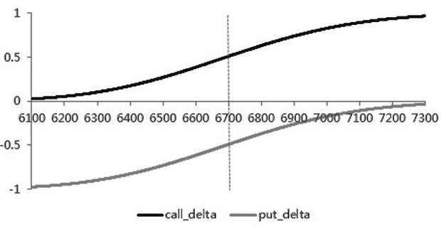 看跌期权Delta变动范围是-1至0,深度实值趋于-1,深度虚值趋于0