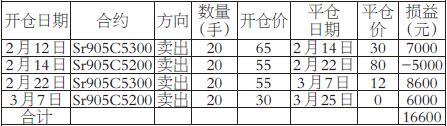 2月12日,该投资者以65元/吨的价格,卖出Sr905C5300合约20手,每手10吨,共计收取权利金13000元。期权展期操作的依据是白糖期货905合约价格的波动,每波动100元,期权头寸就会相应地进行调整,即Sr905合约价格以2月12日价格为基准,上涨100元/吨,期权执行价格就会调整到5400元/吨;标的合约价格下跌100元/吨,期权执行价调整到5200元/吨。期权Sr905C5300合约的到期日为标的Sr905合约到期前两个月的倒数第五个交易日,即3月25日。在2月12日到3月25日期间,Sr905合约价格波动区间为4917—5278。根据既定的策略,Sr905合约价格区间振荡。该投资者不断根据标的物价格对期权持仓进行调整,分别在2月14日、2月22日、3月7日进行展期操作,最后Sr905C5200合约持有到期,标的物价格低于执行价,期权买方选择不行权,期权作废。该投资者的策略具体实施结果如下: