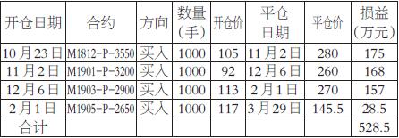我们以豆粕期权为例。2018年10月,某饲料企业认为中美贸易战不会大规模扩散,达成协议的可能性较大。中国大豆很大一部分是从美国进口,如果中美贸易关系恶化,豆粕价格必然上涨;反之,则会下跌。因此,其认为豆粕价格下跌的可能性较大,为保证利润,又不损失豆粕价格上涨带来的收益,其董事会研究决定买入看跌期权,周期为5个月,在期权到期之前提前平仓,进行展期操作。根据豆粕价格的变化,不断调整期权合约头寸,为降低期权成本,买入实值期权。2018年10月23日,该企业买入看跌M1812—P—3550期权1000手,权利金价格为105元/吨,共支付权利金105万元。2018年11月2日进行展期操作,原期权合约平仓,平仓价格280元/吨,收入权利金280万元,同时买入看跌M1901—P—3200期权1000手,权利金价格为92元/吨,共支付权利金92万元。2018年12月6日再次进行展期操作,原期权合约平仓,平仓价格260元/吨,收入权利金260万元,同时买入看跌M1903—P—2900期权1000手,权利金价格为113元/吨,共支付权利金113万元。2019年2月1日,又一次次进行展期操作,原期权合约平仓,平仓价格270元/吨,收入权利金270万元,同时买入看跌M1905—P—2650期权1000手,权利金价格为117元/吨,共支付权利金117万元。该企业的策略具体实施结果如下: