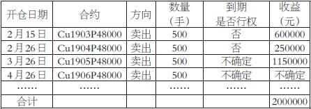 我们以铜期权为例。2月某投资机构研究部门研究认为,本年度全球宏观经济略有改善,中美贸易战继续恶化的可能性较小,达成协议的可能性较大,因此会出现较大的风险。铜的供需面也谨慎乐观,其中供给面的不确定性更大,这使得铜价深跌的可能性较小,即使出现急跌,但持续时间不会太长,更可能的趋势是区间振荡,振荡中枢可能是48000—49000。因此,卖出看跌期权较为合适,执行价选择在48000元,首选合约为Cu1903P48000合约,持有到期,并进行期权时间展期操作,即合约到期后,继续卖出Cu1904P48000合约。如果到期,标的物价格低于执行价,期权买入方行权,则该机构在最后交易日将期权对冲平仓,当天卖出等量的Cu1904P48000合约。具体操作如下: