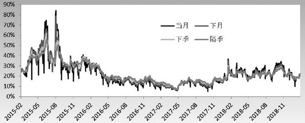 2015年年中股市异常波动,期权IV值达到历史高峰水平,最高时期当月IV值竟达到了86.7%,远月IV值也达到65%的高点。80%以上的IV值意味着市场预期未来标的每天涨跌幅平均在5%以上,但是这近乎不可能,表明了当时市场恐慌至极,期权IV值被极度高估。然而,经历股市高点急跌之后,IV值回归理性状态,波动范围在5%—40%区间。