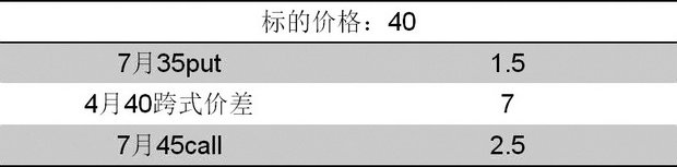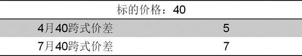 我们还可以卖出1手短期跨式价差的同时买入1手较长期的跨式价差,这就是跨期跨式价差策略。因为短期跨式价差的时间价值消失得比长期跨式价差更快,该策略的主要目的也是为了赚取卖出短期期权的时间价值。例如,我们可以在卖出4月40跨式价差的同时买入7月40跨式价差,卖出1手4月40跨式价差有5个点的收入,而买入7月40跨式价差有7个点的支出,总体上该跨期跨式价差策略有2个点的支出。由于卖出的短期跨式期权可以完全得到买入的长期跨式期权的保护,无论标的价格如何变动,该策略的最大亏损都会限制在最初的2个点支出范围之内。