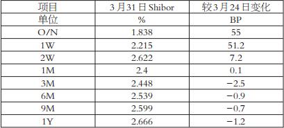 上周,国内市场利率呈现短强长弱的态势。一方面,受季末银行MPA考核的影响,市场流动性阶段性偏紧,短期利率大幅上升;另一方面,受央行降准的影响,国内整体流动性充裕,中长期利率小幅走弱。截至3月31日,上海银行间同业拆放利率(Shibor)隔夜、1周期、2周期、1月期利率分别报收于1.838%、2.215%、2.622%、2.4%,较3月24日分别上升55、51.2、7.2、0.1个基点;3月期、6月期、9月期、1年期利率分别报收于2.448%、2.539%、2.599%、2.666%,较3月24日分别下降2.5、0.9、0.7、1.2个基点。