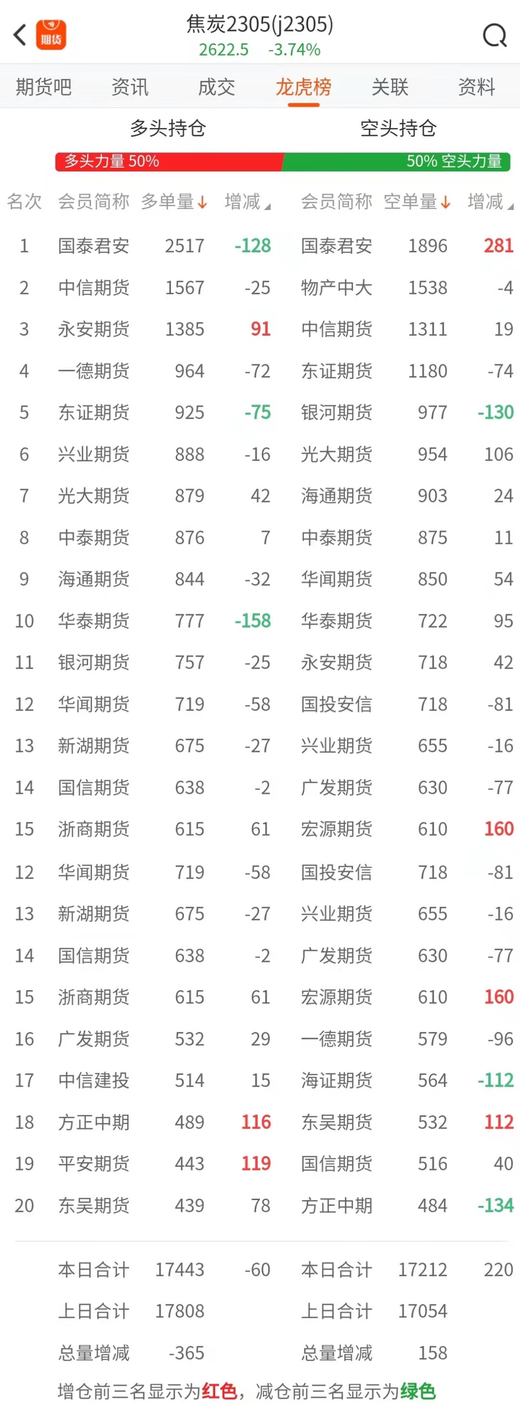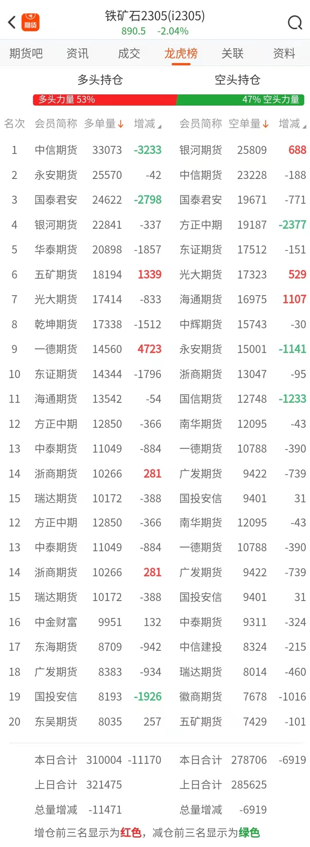 截至4月3日收盘,螺纹钢2305收4044/吨,跌3.14%;热卷2305收4181/吨,跌2.7%;铁矿石2305收890.5元/吨,跌2.04%;焦炭2305收2622.5/吨,跌3.74%;焦煤2305收1779.5元/吨,跌3.76%。 螺纹钢2305合约前20席位多单减仓31665手至47.8万余手,空单减仓17701手至49.9万余手。其中,国泰君安期货多单减持3739手,空单减持11993手,整体呈净多900手。 各品种具体如下: ![]() 各品种持仓情况具体如下: ![]() ![]() ![]() ![]() ![]() 注:可通过点击东方财富期货PC端左侧“龙虎榜”栏目及东方财富期货APP行情页面“龙虎榜”栏目查看各类机构持仓及盈亏榜单信息。 ![]() ![]() (文章来源:东方财富研究中心) (责任编辑:admin) |