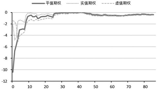 然而,波动率期现结构的问题仍然存在。由于“黑天鹅”事件的冲击,对不同到期日的期权波动率的影响幅度不同,近月合约在大事件降临时,隐含波动率会大幅上升,而远月合约所受的影响相对较小。然而,当“靴子”落地后,又会出现近月合约波动率升水后迅速回落、远月合约波动率小幅回调的情况。因此,当投资者用卖出远月合约期权的方式对冲Vega的时候,即使根据不同时期波动率的期现结构,也很难做到完美的Vega对冲。总的来说,做多Gamma策略必然面对Vega风险,在波动率下降的行情中,尤其需要做好Vega对冲,但是想要做到Vega中性的动态平衡很难。