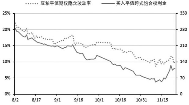 图为平值跨式期权组合的权利金和波动率变化(2017年8—11月)