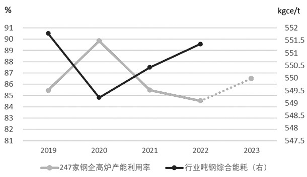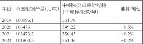 表为中钢协会员2019—2022年单位能耗情况 通过比较2019—2022年单位能耗与铁钢比、燃料比等影响耗能的生产技术指标发现,近几年这些指标在单位能耗变动上并没有体现出太多的影响一致性。不过,高炉产能利用率与年度单位能耗呈现明显的反向关系,即高炉产能利用率高时吨钢能耗较低,这应该与能耗效率的提高有直接关系。