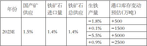 表为不同政策预期场景下对应的生铁产量预估 按照“增长1.4%”的铁矿石年度供应预判,2023年全国铁矿石供需格局会随着不同粗钢产量控制的场景发生变化:不控制粗钢产量,铁水产量增长1%,铁矿石港口库存将出现2500万吨的下降;按照相较2022年行业能耗持平来控制粗钢产量,铁矿石港口库存年底将增加500万吨;按照相较2021年粗钢产量持平来控制粗钢产量,铁矿石港口库存年底将下降1500万吨;按照相较2022年粗钢产量下降2.5%来控制粗钢产量,铁矿石港口库存年底将增加5000万吨。由此可见,2023年铁矿石市场一定程度上还是较为依赖粗钢压减政策具体要求的。