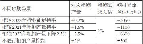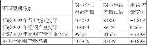 图为中钢协会员单位能耗与整体行业产能利用率变化 考虑到2023年钢材需求及生产利润将有所修复,行业整体产能利用率预计较2022年明显回升,较2021年也会稍有抬升,毕竟2021年下半年由于政策影响,钢材行业产能利用率显著下滑。截至3月24日的周度数据显示,目前,全国247家样本钢厂的高炉产能利用率已经提高至85.6%,未来还有进一步上升的空间。按照年均86.5%的高炉产能利用率推算,2023年中钢协会员单位能耗数据可能下降至每吨550千克标准煤的水平。类似的,全行业吨钢能耗有望在2023年实现0.2%的下滑幅度。结合对行业单位能耗的判断,相对2022年行业能耗持平意味着相较2022年粗钢产量增长0.25%,对应的全国粗钢产量预计为102052万吨。 相较2021年粗钢产量持平 该猜测思路在于2022年粗钢产量的下滑并不是政策决定的,而是终端需求受到公共卫生事件的影响、以销定产的结果。如果按照产业政策的一致性和连续性,的确是可以参照2021年全国粗钢产量进行平控指导的。 若按照2021年全国粗钢产量水平来平控,则2023年全国粗钢产量为103473.2万吨,同比增长1.6%。 相较2022年粗钢产量下降2.5% 该猜测很可能参照的是2021年。2021年是粗钢产量压减政策出台的第一年,全国粗钢产量压减目标就是2500万吨。若继续按照2500万吨的产量去压减,则2023年全国粗钢产量就会减少至99300万吨,同比下降2.5%。 据了解,各机构对于2023年粗钢需求变化的预判集中在【-1%,2%】,我们的预期也比较乐观,认为在1%。因此,如果终端需求没有显著低于预期的表现,那么同比压减2.5%的粗钢产量政策可能会造成钢材价格阶段性明显波动。 3 不同粗钢产量情景的影响 对钢材的影响 粗钢产量不同对钢材市场的影响相对直观。按照前文罗列的三种产量控制场景,钢材市场将出现供不应求局面。我们在评估年度平衡表时认为,2023年粗钢需求增长1%、粗钢供应增长2%,对应的铁水供应增长1%。这种情况下,钢材市场整体处于供需均衡状态,到2023年年底钢材库存才会微降。