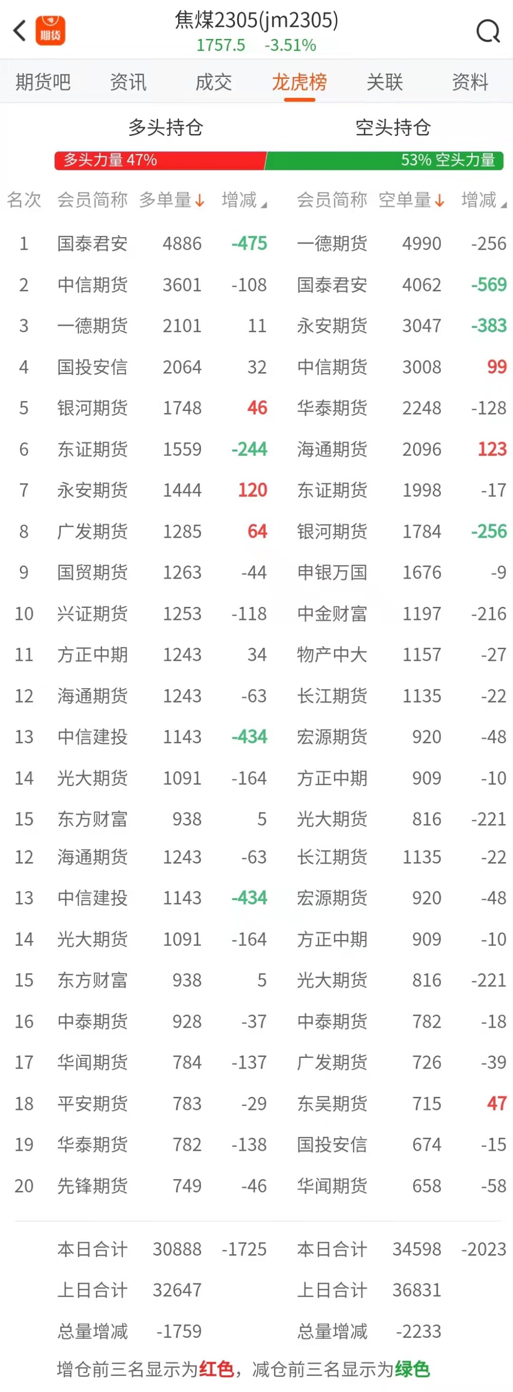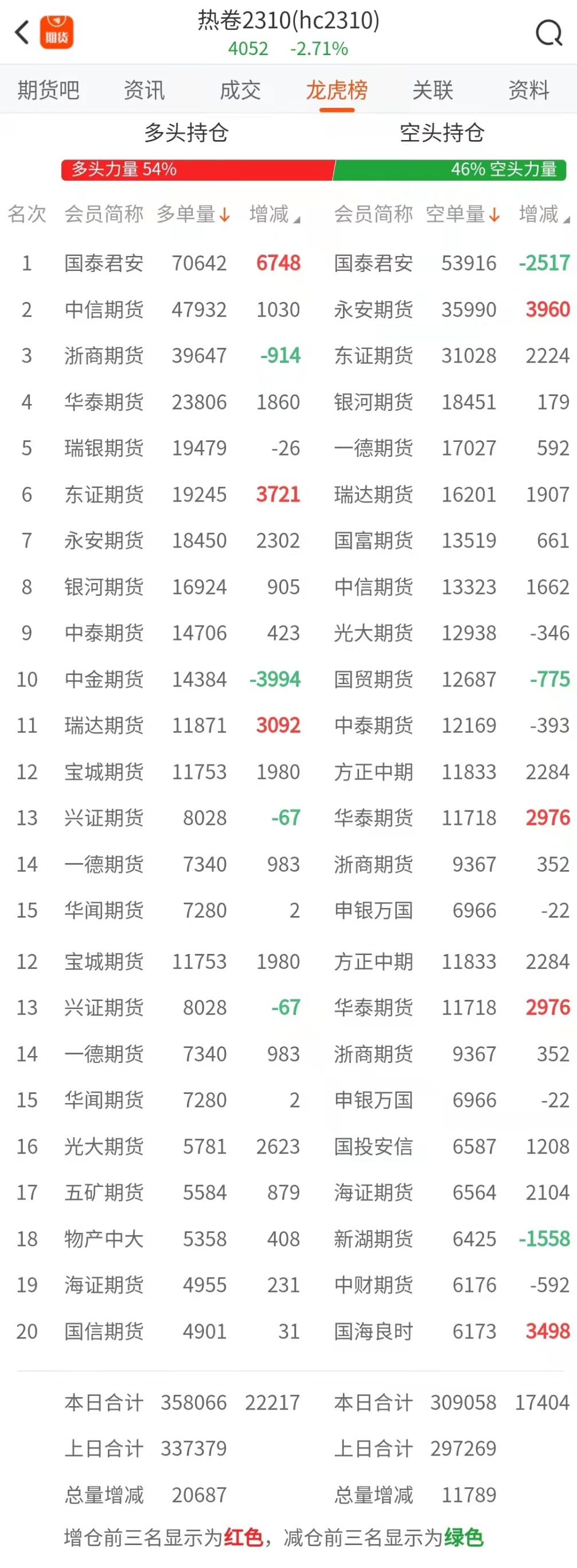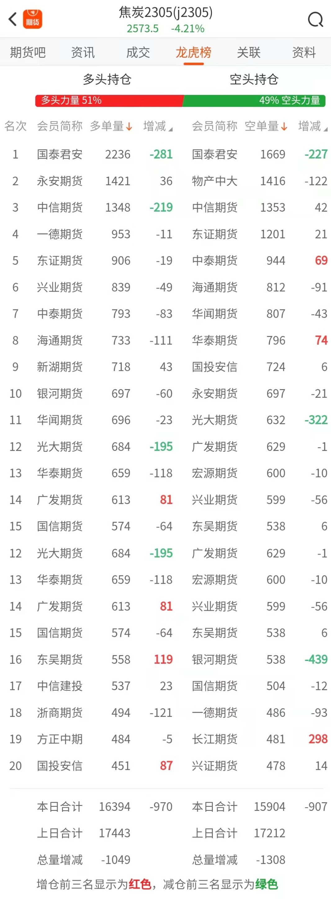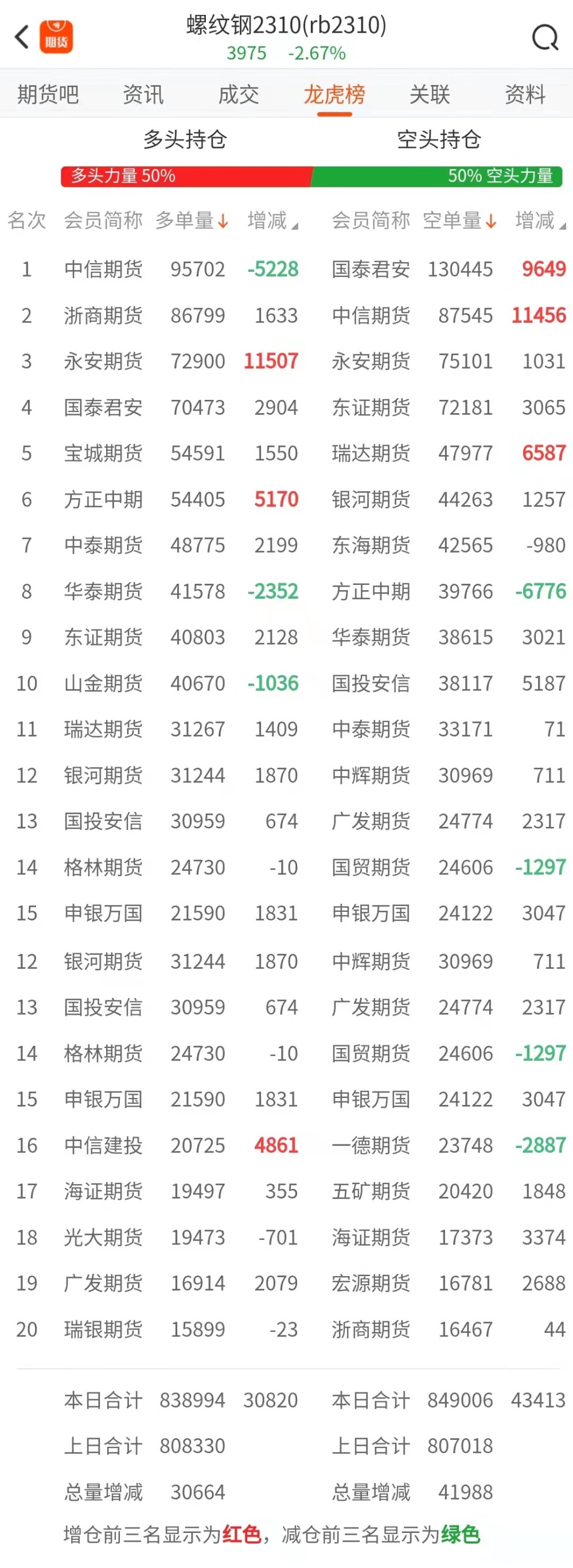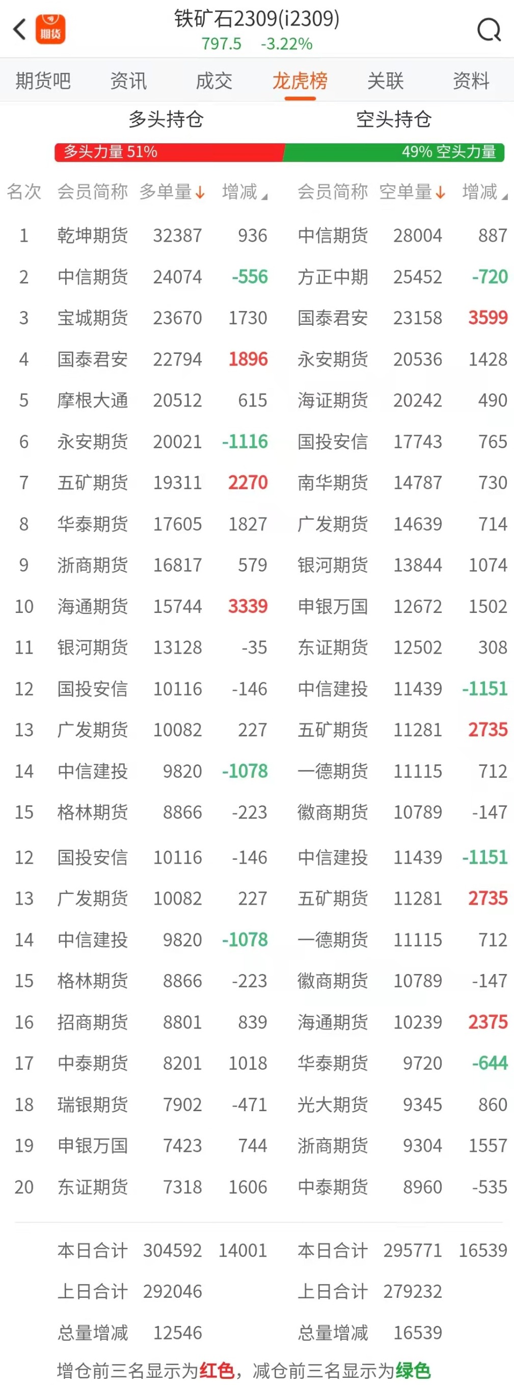 截至4月4日收盘,螺纹钢2305收3975/吨,跌2.67%;热卷2305收4052/吨,跌2.71%;铁矿石2305收797.5元/吨,跌3.22%;焦炭2305收2573.5/吨,跌4.21%;焦煤2305收1757.5元/吨,跌3.51%。 螺纹钢2305合约前20席位多单增仓30820手至83.8万余手,空单增仓43413手至84.9万余手。其中,中信期货多单减持5228手,空单增持11456手,整体呈净多8157手。 各品种具体如下: ![]() 各品种持仓情况具体如下: ![]() ![]() ![]() ![]() ![]() 注:可通过点击东方财富期货PC端左侧“龙虎榜”栏目及东方财富期货APP行情页面“龙虎榜”栏目查看各类机构持仓及盈亏榜单信息。 ![]() ![]() (文章来源:东方财富研究中心) (责任编辑:admin) |