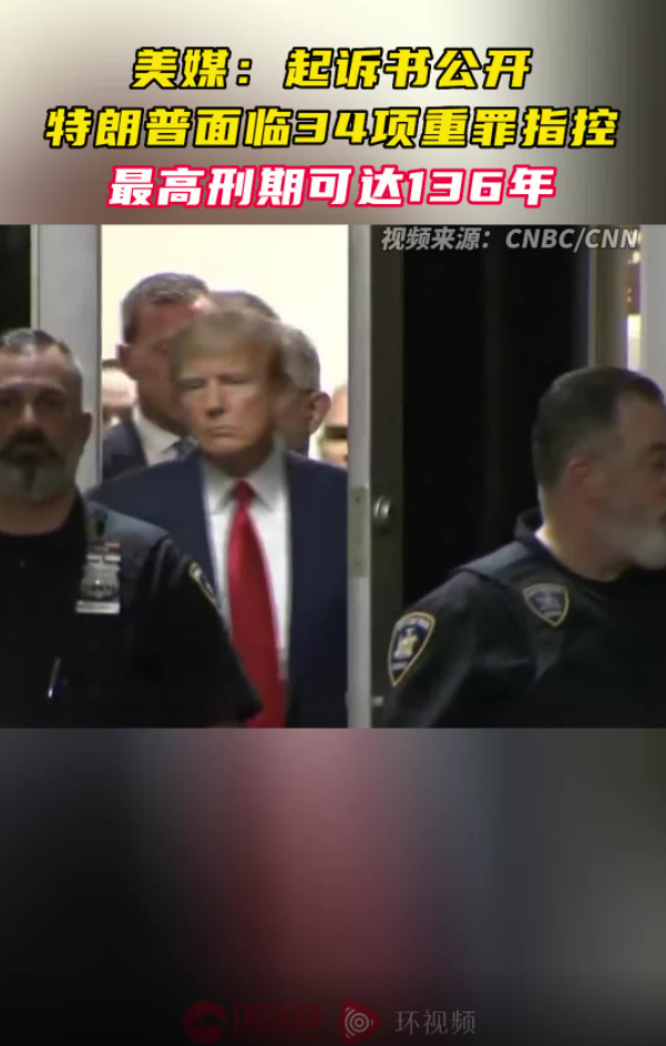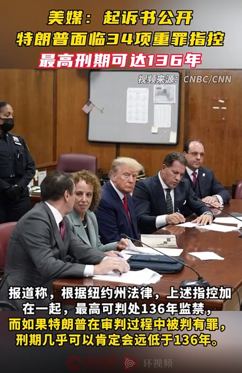 外媒:起诉书公开 特朗普面临34项重罪指控 最高刑期可达136年