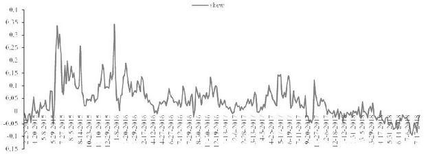平价波动率的变动是衡量波动率曲面变化的基准,另外,考虑到流动性,这里交易的标的选用平值与虚值的期权合约,对它们的隐含波动率曲面进行数据处理,构建偏度模型。这里定义偏度