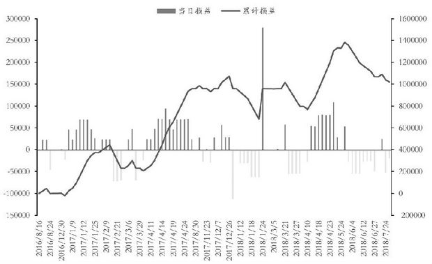 采用2016年7月19日至2018年8月23日的数据进行测试,则2015年2月9日至2016年7月18日数据为测试期初的偏度历史序列,随着测试日期的增加,该序列偏度数据也随着动态补充。将每日的偏度与当日之前的偏度序列的分位数进行比较,如果大于序列70%分位数为卖出偏度的信号,小于序列20%分位数为买入偏度的信号,如果持仓,则在历史数据(45%—55%)区间内为平仓信号。每次交易手数为两个0.25delta期权合约各10张,0.5delta合约各5张。在持仓过程中,设定风险敞口阈值为当天收盘价乘以合约乘数(10000),即delta敞口超过一张期权合约所挂钩的标的价值后就采用买入或卖出标的的方式来配平delta。