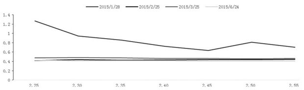 需要说明的是,由于临近到期的影响,波动率曲面虚值与实值部分会发生较大的倾斜改变,因此不能直接使用隐含波动率进行计算,这样会造成临近到期的波动率过大从而错误进场交易。例如在交易日为2015年1月27日的50ETF期权波动率曲面,对于当天运行的四组到期日不同的期权合约,会呈现出如下图所示的波动率结构: