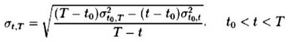 这里采用固定到期的方法,例如在上面的例子中,到期日为2015年1月28日和2015年2月25日的两组期权合约在运行期间的临近到期天数是固定的日历日28天,可以认为两组合约固定到期的时间为一个月,同样可以得到固定到期时间为2个月和6个月的两两期权合约组。在不同到期月的每个行权价的隐含波动率都采用插值法进行处理,从而得到固定到期(constant maturities)的波动率曲面。这里插值法是利用两个不同到期日的期权对固定到期的权重进行加权计算: