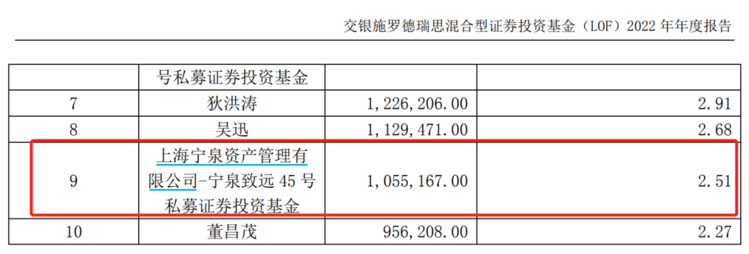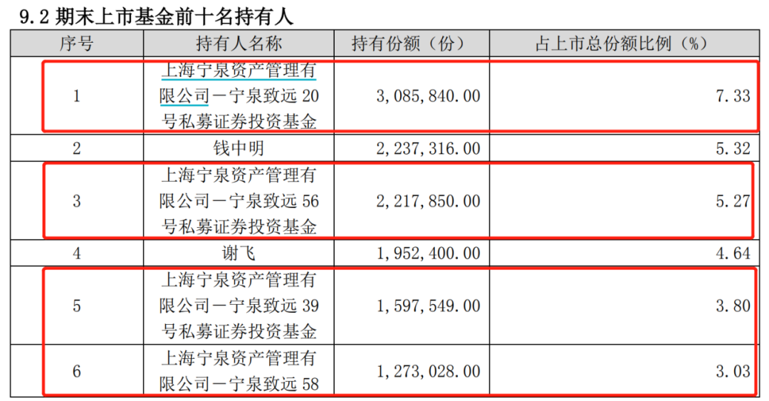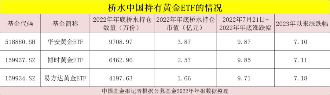 随着近期公募基金2022年年报悉数披露,基金君发现,不少公募基金产品的前十大持有人名单中出现了百亿私募机构旗下私募产品的名字。 比如桥水中国旗下的桥水全天候增强型中国私募基金,在2022年上半年逆势买进3只黄金ETF后,下半年继续坚定持有,到2022年年底合计持有2.04亿份,持仓市值达到8.1亿元左右。黄金ETF自去年7月末以来迎来一波大反弹行情,尤其是今年在全球宏观局势的波动下,涨幅比较大,桥水中国的这一波布局可谓精准。 同时,杨东掌舵的百亿私募宁泉资产也很喜欢买上市的主动权益基金,其到去年年底现身中欧、工银、华夏、交银等几家公募旗下的多只基金的前十大持有人名单。我们一起来看看,为什么私募也爱买公募。 桥水中国持有黄金ETF8.1亿元 逆势布局迎来一波大涨行情 全球最大对冲基金桥水旗下的外商独资私募桥水(中国)投资管理有限公司,近年来管理规模突破百亿,其在中国市场积极做投资布局。基金君发现,桥水中国旗下多只私募产品在公募基金2022年半年报披露之际,首次现身A股市场最大的三只公募黄金ETF的前十大持有人名单。 在去年上半年买进黄金ETF之后,桥水中国一直坚持持有多个季度,截止去年年底,旗下的私募产品仍然持有华安黄金ETF、博时黄金ETF、易方达黄金ETF,合计持有2.04亿份。如果按照去年年底的收盘价算,其合计持仓金额达到8.1亿元左右。 ![]() 值得注意的是,华安黄金ETF、博时黄金ETF、易方达黄金ETF在去年7月21日触及低点以后,展开了一轮大反弹行情;从低位到去年底,三只ETF在市场中涨幅都将近10%。同时,在全球宏观形势波动下,今年黄金ETF的表现也是可圈可点,华安黄金ETF、博时黄金ETF、易方达黄金ETF,年初至今分别上涨了7.10%、7.11%、7.18%。 桥水中国在去年上半年黄金ETF下跌之际逆势布局,阶段性忍受波动,此后随着黄金ETF的反弹,也是赚到了。如果今年上半年还没有减持,浮盈会更高。桥水中国这一波在黄金ETF上的操作可谓十分精准,其逆势布局也迎来了收获。 具体我们再来看看,基金年报显示,去年四季度末,桥水中国旗下的桥水全天候增强型中国私募证券投资基金三号、二号,分别位列第2、第10大持有人,合计持有华安黄金ETF共9708.97万份,期末持仓市值达到3.87亿元;但是,跟去年二季度末比起来,桥水全天候增强型中国私募证券投资基金一号退出了持有人名单。但市场人士认为,桥水中国应该没有减持,只是因为部分持有人加仓了华安黄金ETF,使得其前几位持有人的门槛变高了。 ![]() 同时桥水中国也继续坚守博时黄金ETF,一份也没有卖。基金年报显示,去年年底,桥水全天候增强型中国私募证券投资基金三号、一号、二号,合计持有博时黄金ETF的份额为6462.96万份,期末持仓市值为2.57亿元。 另外,桥水中国旗下的这三只私募基金在去年年底也持有易方达黄金ETF的份额为4197.63万份,期末持仓市值为1.66亿元,跟之前相比也没有变化。 桥水掌门人瑞达利欧去年在采访中表示,在当前不确定的全球环境下,黄金应该是投资组合的重要组成部分,而不是主导部分。他说,黄金就像是一个投资组合的覆盖物或是保险,可以构成一个多样化投资组合的15%。 宁泉资产积极加仓多只公募基金 杨东掌舵的百亿私募宁泉资产也非常喜欢买公募基金,最新披露的基金年报显示,宁泉资产管理的产品,在2022年四季度末现身中欧远见两年定开、中欧创业板两年定开、工银睿智进取一年、华夏创业板两年定开、交银瑞思三年等多只公募基金的前十大持有人名单。主要买的都是这些上市基金的场内份额。 比如宁泉资产旗下的私募基金已经持有交银瑞思LOF多个季度,其早在2021年中报披露的时候就现身该LOF基金的前十大持有人名单,并且坚持持有,不断加仓。 到2022年四季度末,宁泉致远20号、宁泉致远56号、宁泉致远39号、宁泉致远58号、宁泉致远45号等5只私募基金一起现身交银瑞思LOF的前十大持有人名单,合计持有份额为922.94万份,占上市总份额比例的21.94%。 资料显示,交银瑞思LOF成立于2020年2月21日,随后在2020年8月5日上市;截止去年底,该基金规模为60.20亿元。该基金的基金经理是交银施罗德明星基金经理沈楠,具有近8年的基金管理经验,任期业绩也比较好。 ![]() ![]() 还有,宁泉致远20号私募证券投资基金在去年底持有中欧远见两年定开基金149.34万份,占上市总份额比例的0.94%,位列第10位;同时,一家名叫深圳市前海禾丰正则资产的私募机构,旗下也有3只私募产品大举买进中欧远见两年定开A的场内份额,占据了第4、第6、第7大持股人的位置;还有宁波万坤投资旗下万坤东方点冉1号私募基金也现身第9大持股人。 基金君发现,其实宁泉资产旗下的宁泉致远20号私募基金,早在2021年年报披露时就出现在中欧远见两年定开基金的前十大持有人名单中,彼时就持有149.34万份,到2022年底也是一份都没有卖出。 资料显示,中欧远见两年定开基金成立于2019年4月24日,并在2019年5月27日上市交易;截止去年四季度末,该基金A、C份额合计总规模为46.19亿元。 ![]() 同时,宁泉致远39号私募证券投资基金现身中欧创业板两年定开混合基金的持有人名单,在去年四季度末持有份额为164.91万份,占上市总份额比例的1.53%,位列第5位持有人的位置。 基金君发现,宁泉旗下的私募产品早在2021年中报披露的时候就出现在中欧创业板两年定开混合基金的前十大持有人名单中,彼时买进