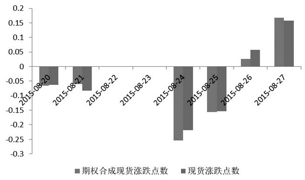 在这种情况下,通过复制期权对冲进一步下跌风险不失为一种较好的选择。例如,通过买入上证50ETF看跌期权、卖出上证50ETF看涨期权,来合成上证50ETF空头头寸。下图计算了当日期权合成的空头头寸涨跌幅情况,当日期权合成的空头头寸跌幅高达13%,比现货指数跌幅要高,可以满足一定量的对冲头寸,并且能够规避第二天指数再次大跌的风险。
